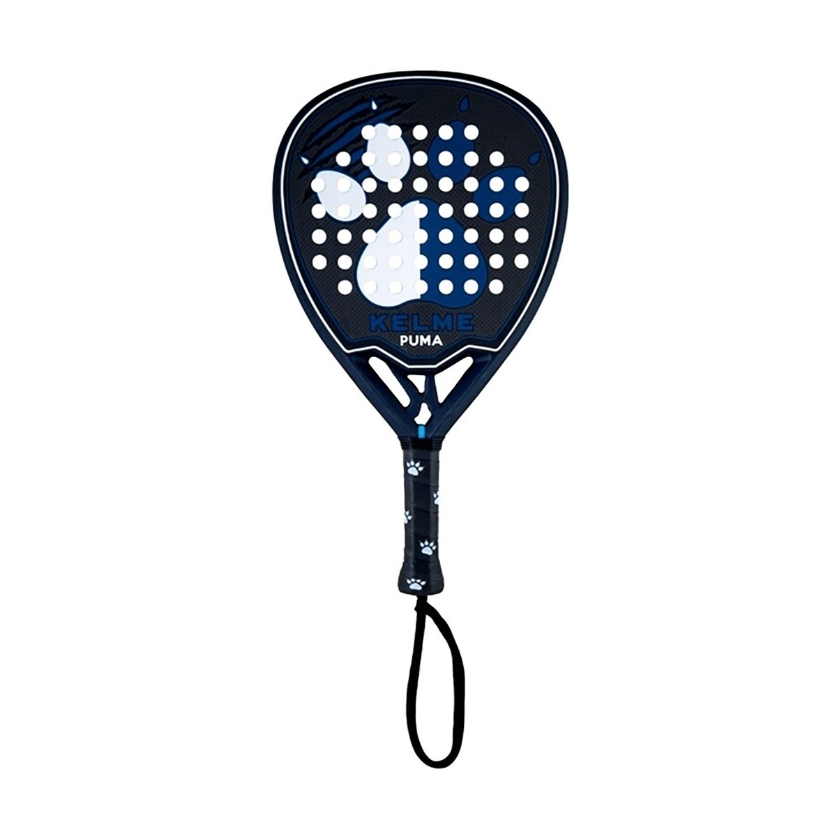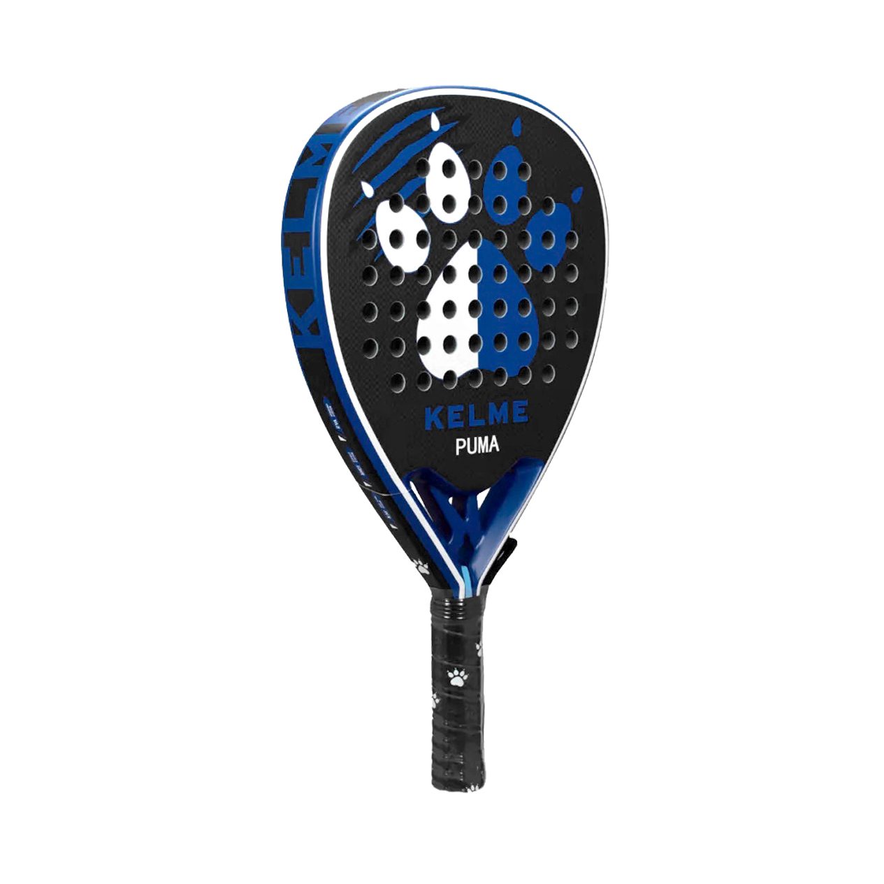 En su diseño, la KELME PUMA es una pala que destaca por ser mate y su elegancia, con un fondo negro y el icono de Kelme en un combinado azul y blanco.